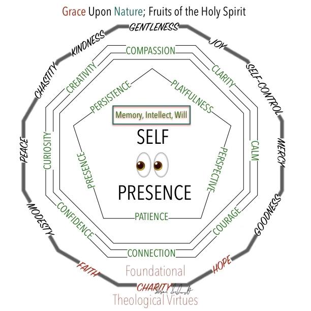 Qualities of Self Presence diagram incorporating the fruits and gifts of the Holy Spirit: